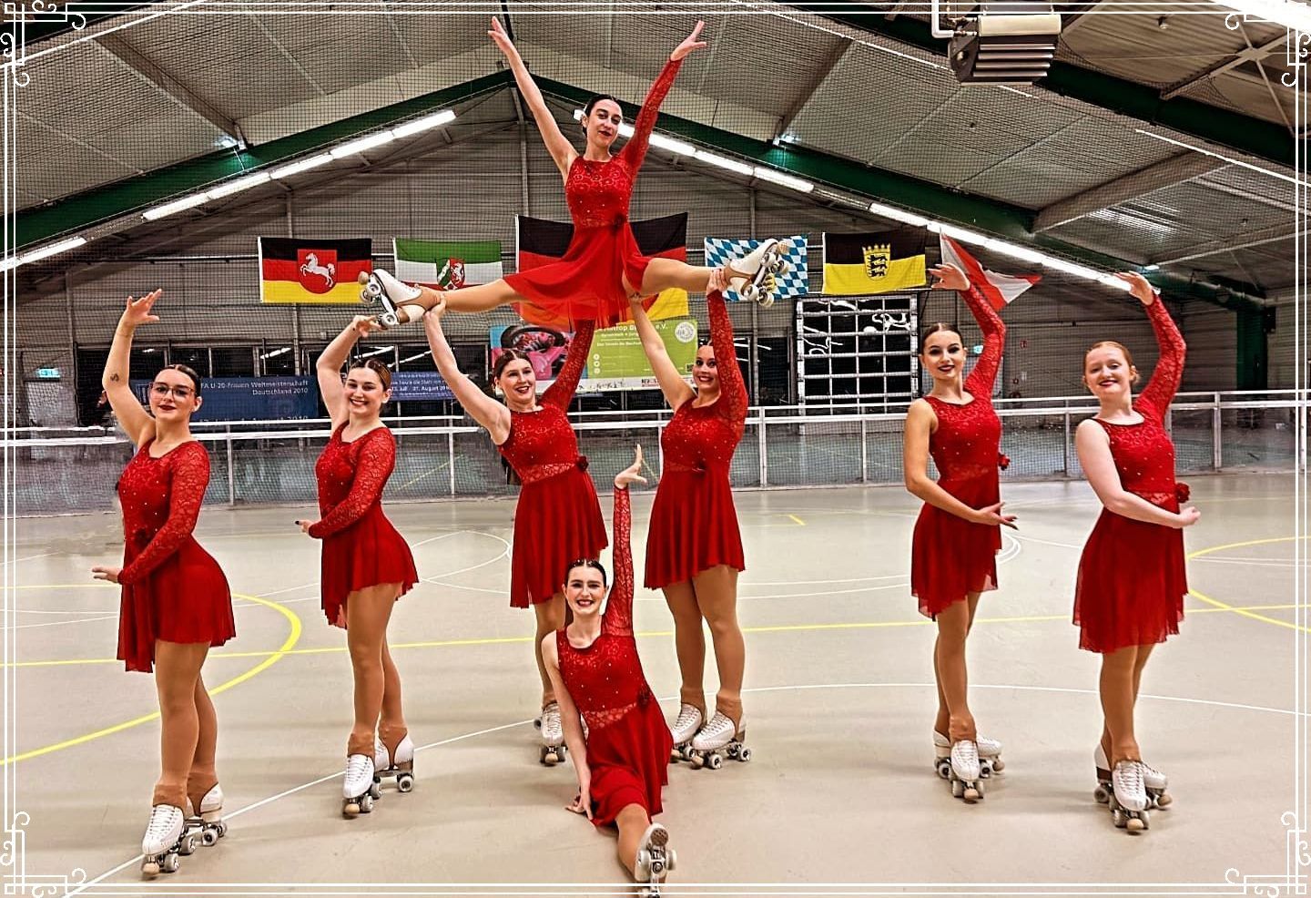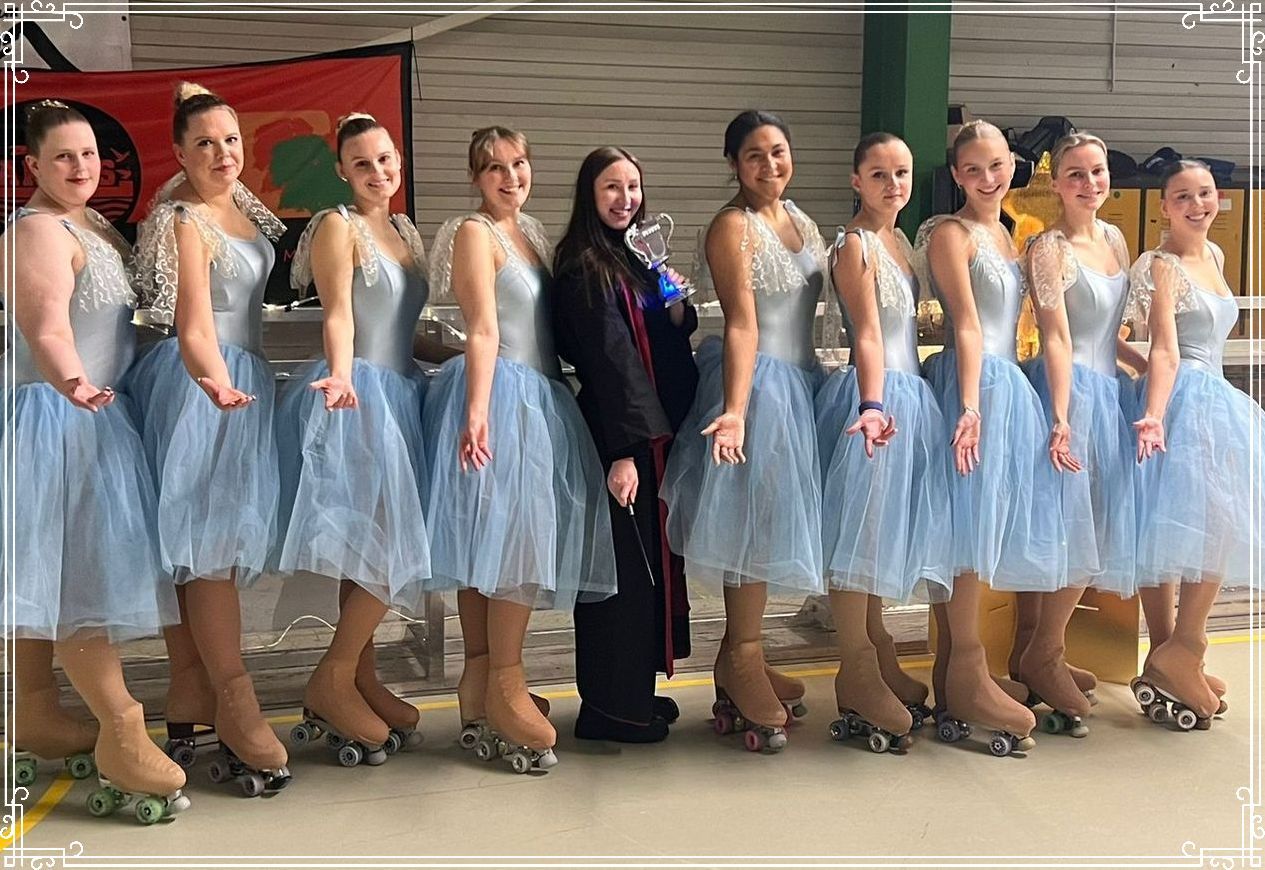 Im zweiten Programmpunkt begeisterte unsere Hobbygruppe gemeinsam mit den Trainerinnen Virginia und Alea das Publikum mit einem zauberhaften Walzer. Eine besondere Note erhielt die Aufführung durch eine schwangere Läuferin, die ohne Rollschuhe mit einem stimmungsvollen „Harry Potter“-Intro ihre Gruppe unterstütze. Eine wunderschöne Darbietung, die alle Anwesenden verzauberte.