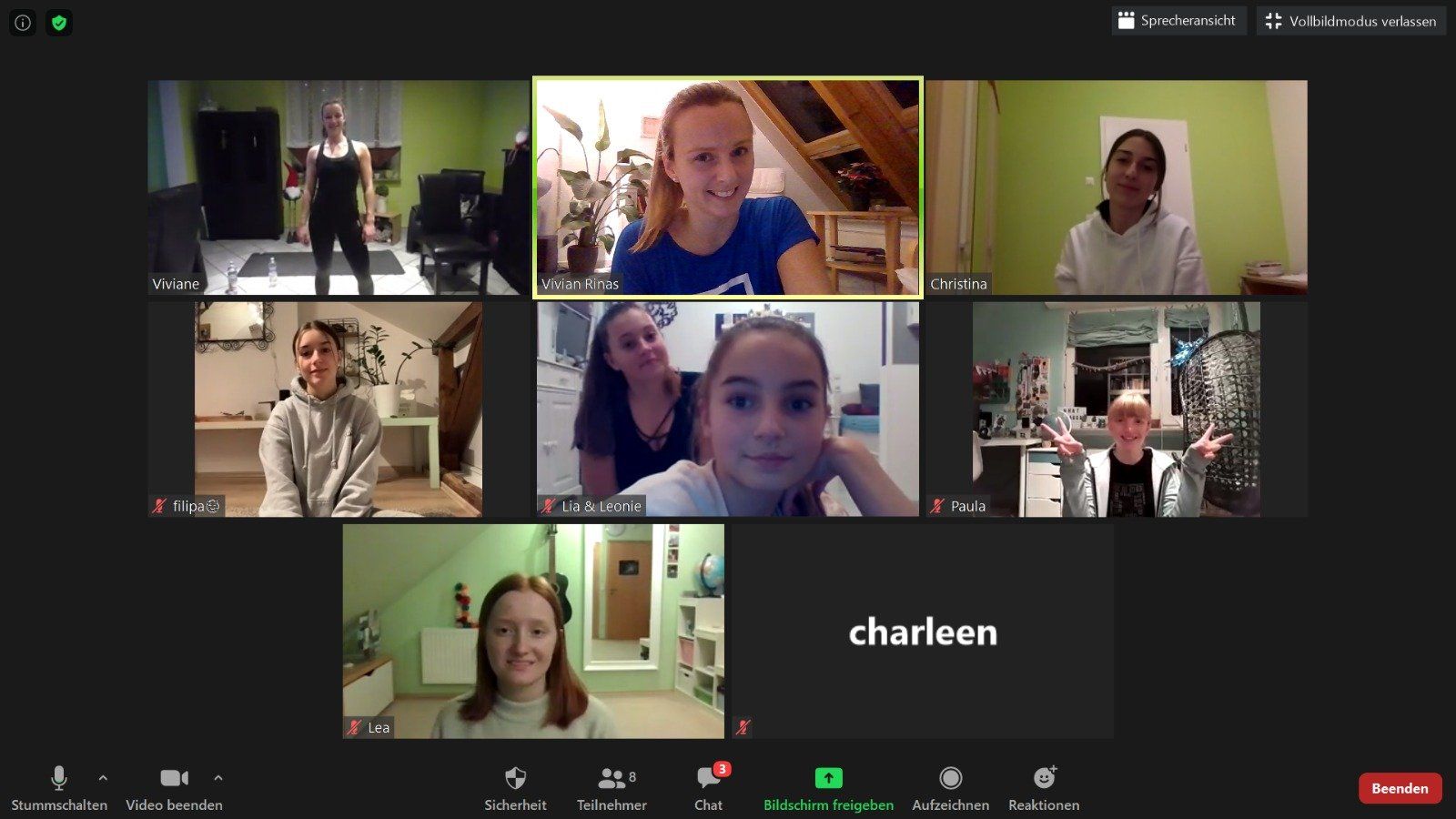 Diese selbstgedrehten Videos werden zusammen mit einem schriftlichen Trainingsplan für jede Trainingseinheit in einer Cloud vereinsintern veröffentlicht. Jede Trainingsgruppe bekommt jeweils an ihren eigentlichen Trainingstagen eine neue, auf das Leistungsniveau der Gruppe abgestimmte Trainingseinheit zur Verfügung gestellt, die dann freiwillig und flexibel absolviert werden kann. Die Einheiten gestaltet Viviane sehr abwechslungsreich. Ausdauertrainings wie Joggen, immer neue Workouts, Trockensprünge, und das Stretching sind die Grundbausteine des Corona-Home-Workouts.